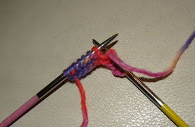 Nu vind ik het een beetje "gedoe" met die omwikkelde steek. Ik had vroeger een andere methode geleerd om toch verkorte naalden te breien - zonder gaatjes. Die gaat als volgt: