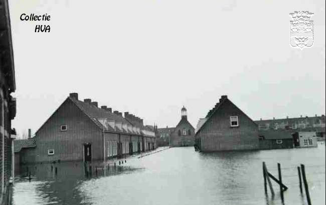 In 1953 breken echter wel de dijken dichtbij ons dorp, en Arnemuiden en Kleverskerke stromen onder water. Deze foto's komen uit de beeldbank van de Historische Vereniging.