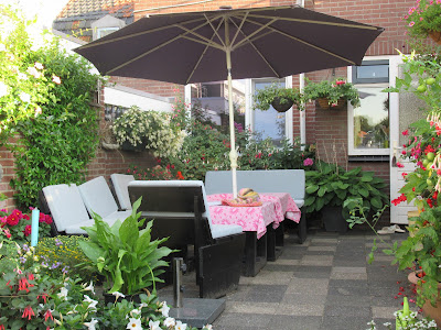 Na het werk duik ik nog even de tuin in, want een dag overslaan met watergeven is er nu niet bij. Maar daar krijg ik wel wat voor terug, ik geniet met volle teugen van alle bloemen in onze kleine tuin.