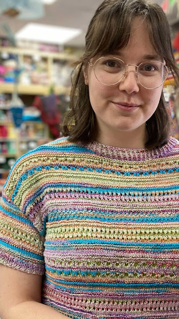 Gewoon tricotsteek is al genoeg voor dit draadje maar onderstaand truitje heeft een gaatjespatroon en af en toe een ribbel en ook dat komt mooi uit! Er zijn 6 kleuren, je vindt ze
